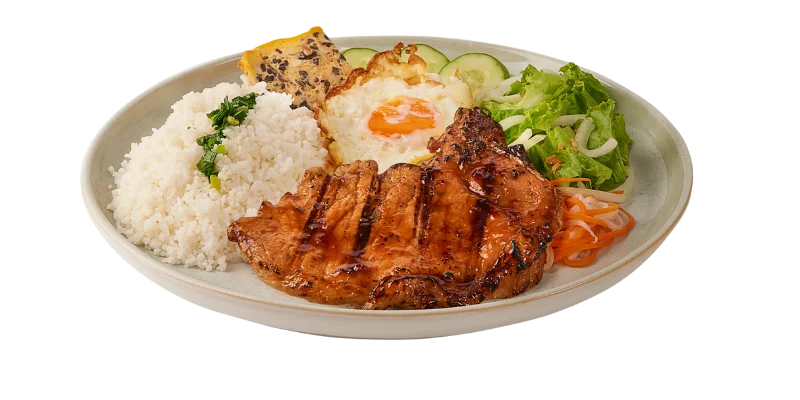 GRILLED PORK CHOP WITH EGG MEATLOAF & FRIED EGG ON BROKEN RICE | 18.95